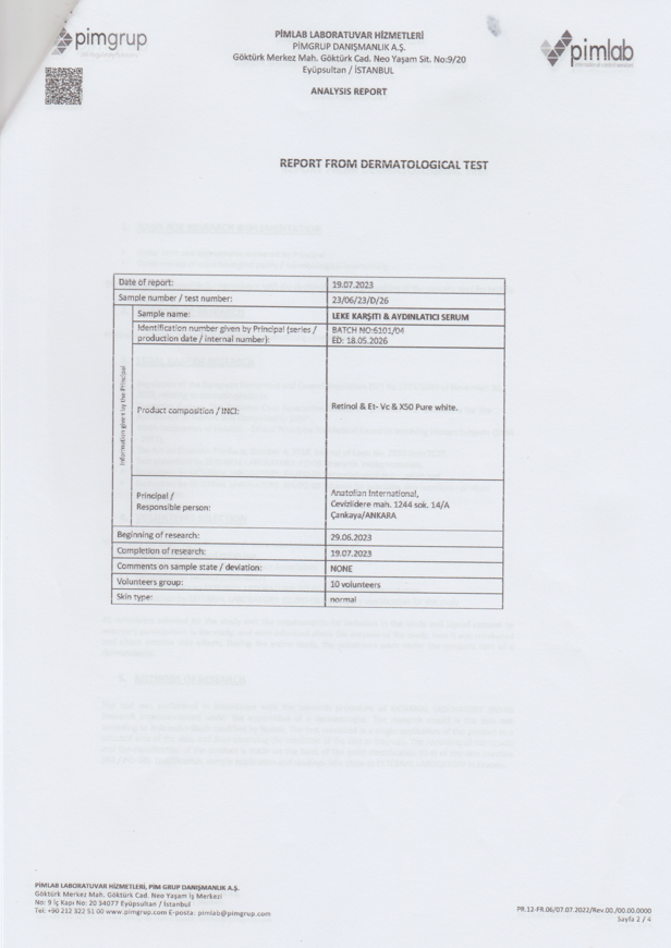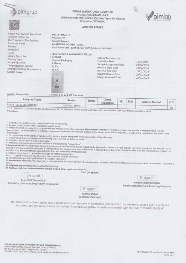 Anatolian International’ın leke karşıtı ve aydınlatıcı serumu, cilt tonunu dengelemek ve cildi daha canlı bir görünüme kavuşturmak için geliştirilmiştir. Yoğun Vitamin C, Arbutin ve patentli X50 Pure White Drone Teknolojisi ile cildin derin katmanlarına etki ederek, koyu lekeleri azaltır ve cilde doğal bir parlaklık kazandırır.